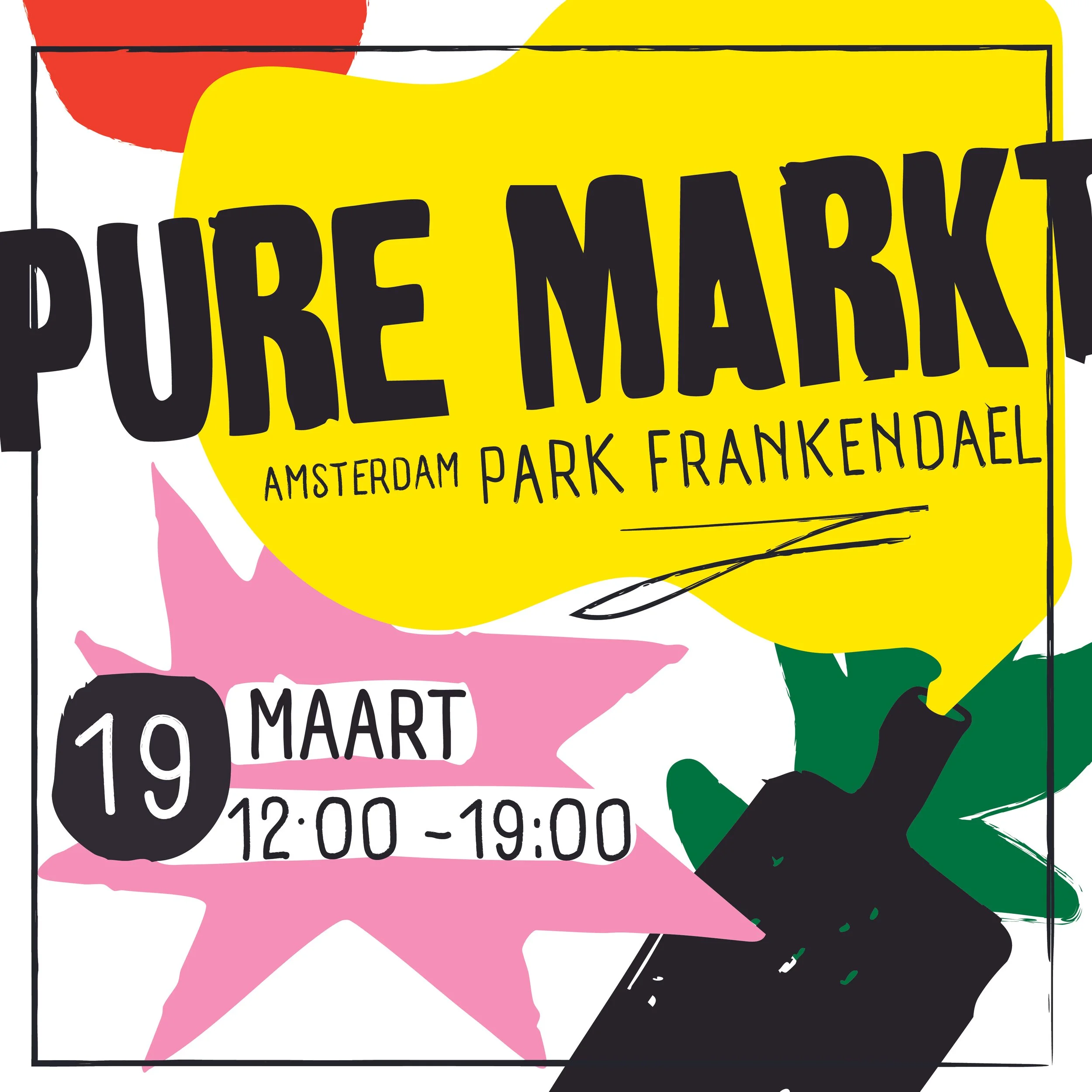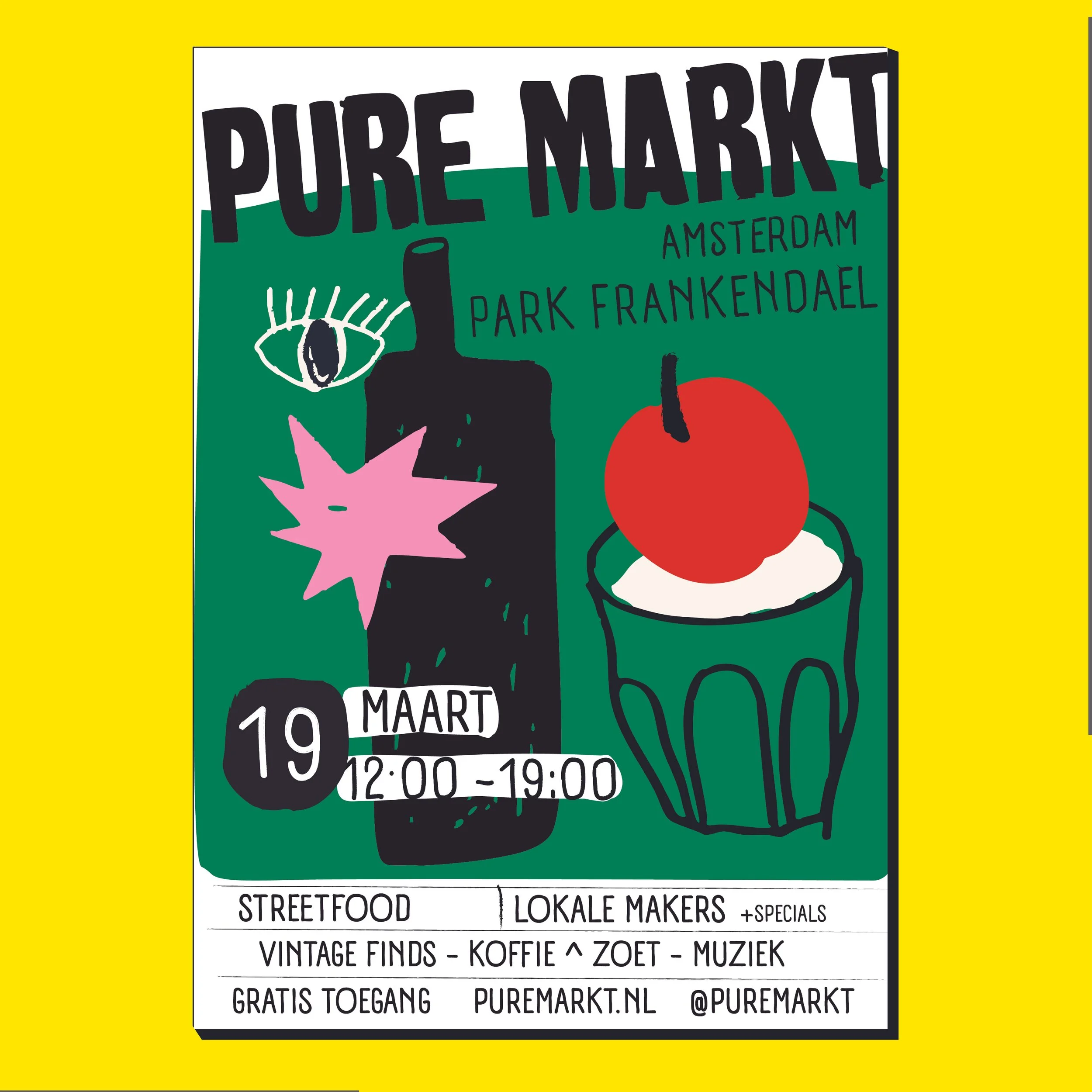 For Pure Markt (Amsterdam Park Frankendael), I designed a vibrant and playful poster capturing the energy of the event. The market brings together street food, local makers, vintage finds, and music — a relaxed day in the park centered around community and discovery.